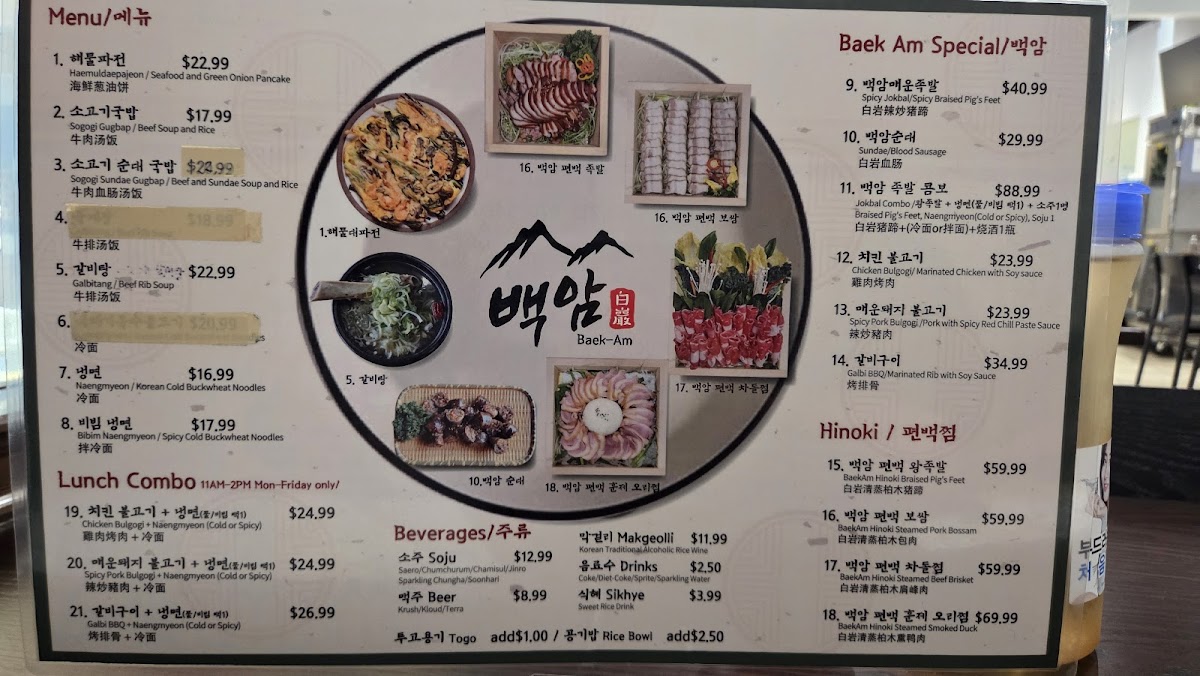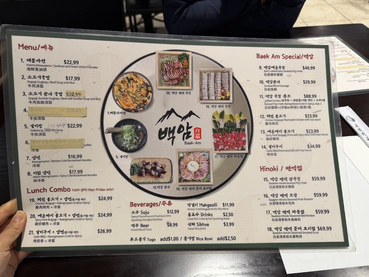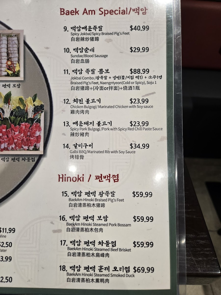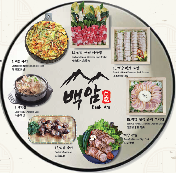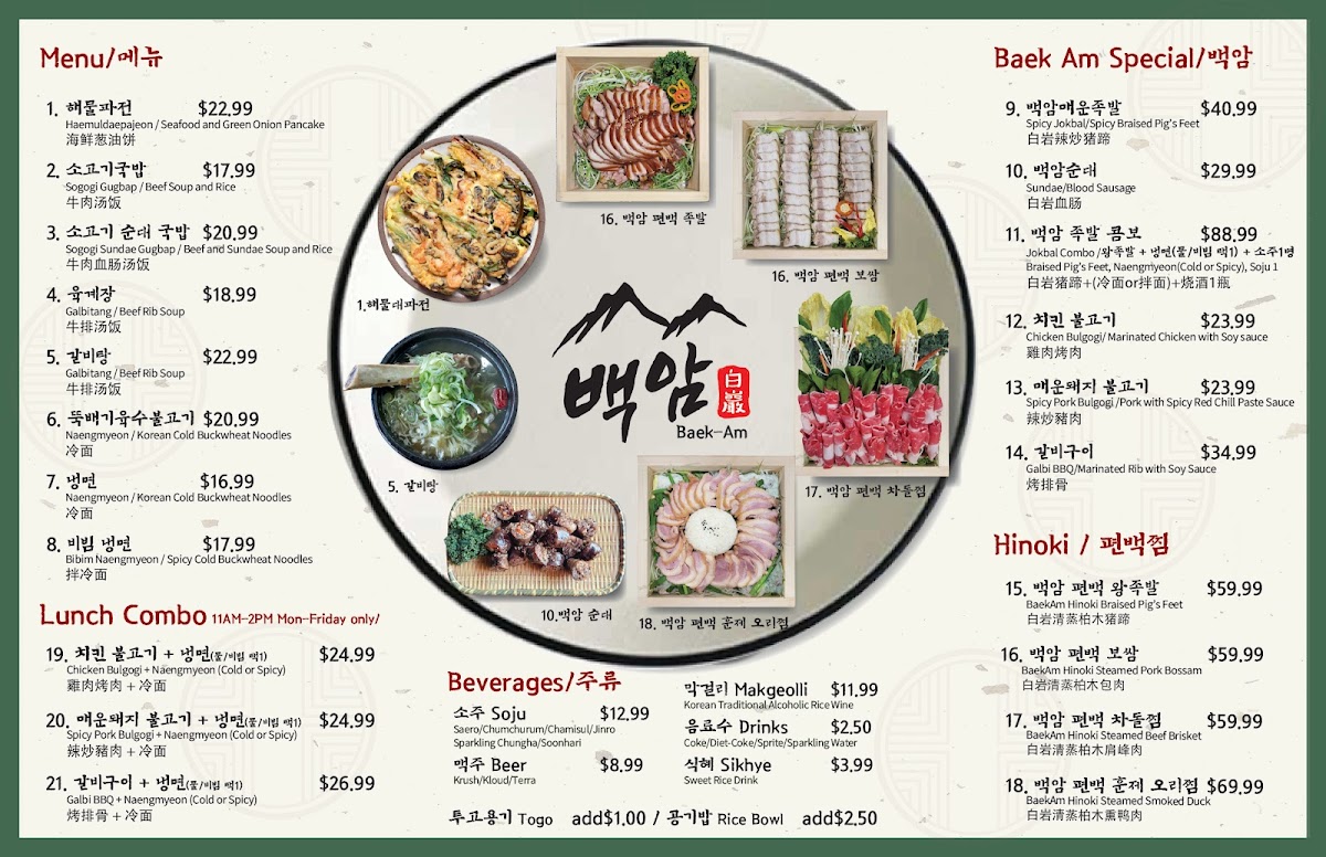 The menu showcases a variety of culinary highlights, including the Baekam Hinoki Steamed Beef Brisket and Steamed Smoked Duck, both priced at $59.99, offering a rich and savory experience. For those craving savory pancakes, the Seafood Pancake (해물파전) at $22.99 adds an irresistible crunch to your meal.